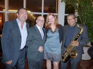 Sob o comando do competente Gerente Geral Dagoberto Alves Silva, com vasta experiência hoteleira no Brasil e no exterior, o Hotel Luzeiros passou a oferecer atrações sociais que já conquistaram os maranhenses. Além do sucesso da tradicional feijoada com pagode ao vivo aos sábados no Restaurante Mearim, feijoada que comprovei ser um sucesso, outro programa imperdível é a noite Mará Jazz, com apresentações ao vivo todas as quintas-feiras no Lobby Bar do Luzeiros, do trio de jazz formado pelo internacional saxofonista Sávio Araújo, acompanhado do músico Henrique Duailibe e da cantora alemã Andrea Canta. Sempre a partir das 19h e sem cobrança de couvert artístico. Sucesso também foi a Noite dos Namorados do Luzeiros, que teve Buffet especial e clima de muito romantismo. Nota dez para as inovações de Dagoberto Silva! Na foto de Danielle Vieira: Dagoberto Alves Silva, Gerente Geral do Hotel Luzeiros entre os músicos Henrique Duailibe, o saxofonista Sávio Araújo e a cantora alemã Andrea Canta.