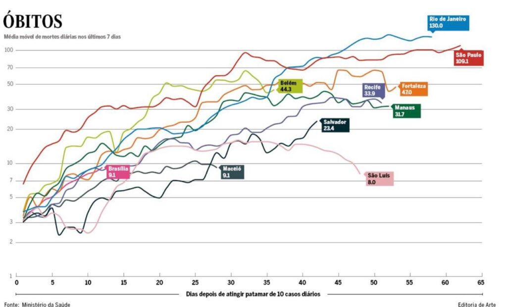 Reportagem do jornal O Globo deste fim de semana fez o retrato da situação de algumas capitais. São Luís é a que aparece com menor número de mortes diárias na última semana: oito.