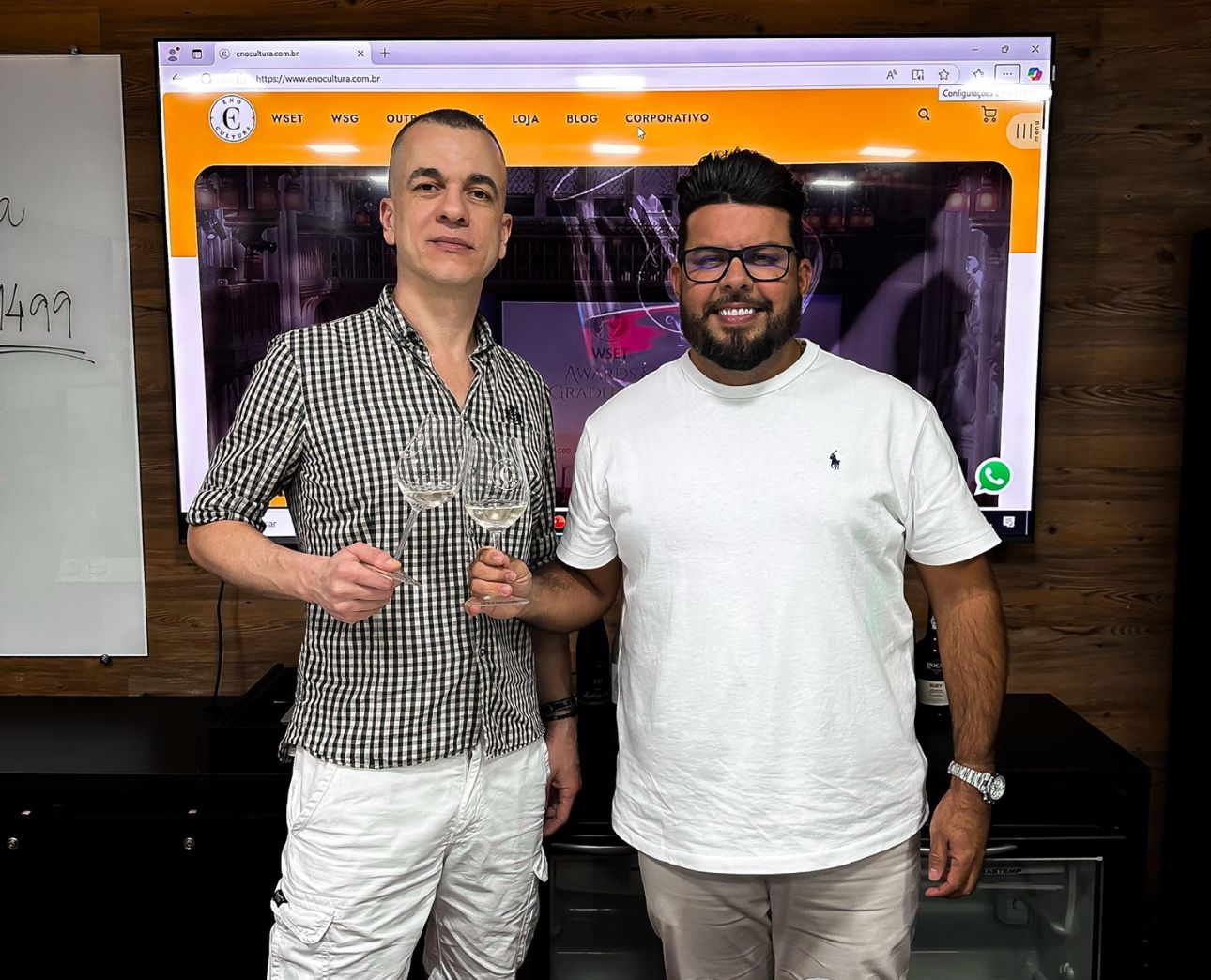 O professor Vinícius, detentor do título WSET4, da escola Eno Cultura com Werther Bandeira durante a imersão sobre vinhos em São Paulo.
