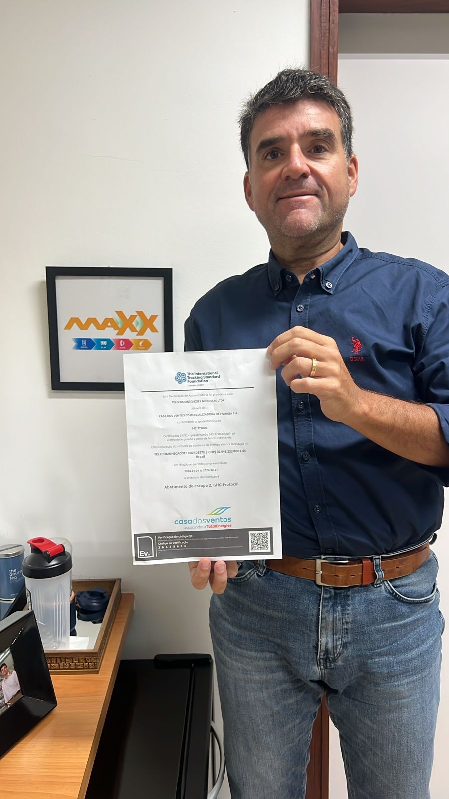 FOTO – DIVULGAÇÃO: O CEO da Maxx Augusto Diniz exibe o certificado que atesta a compensação com energia limpa na operação da operadora.