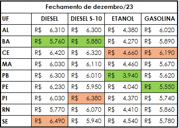Dados do Índice de Preços Edenred Ticket Log (IPTL), levantamento que consolida o comportamento de preços das transações nos postos de combustível, trazendo uma média precisa, apontaram que no fechamento de dezembro o preço médio do litro do diesel comum fechou a R$ 5,94 na Região Nordeste, com redução de 2,14%, ante a primeira quinzena do mês. Já o preço do diesel S-10 recuou 1,94% e foi comercializado a R$ 6,06. O preço médio da gasolina caiu 0,17% e fechou a R$ 5,85. Após redução de 0,47%, o etanol fechou o ano a R$ 4,26.