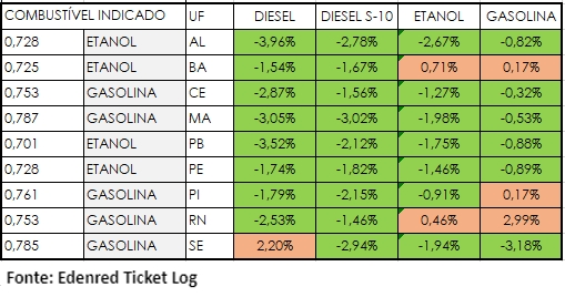 “Estados da Região Nordeste se destacaram com as reduções mais expressivas do país, como é o caso do Sergipe, onde o preço do litro do diesel comum reduziu 7,57%, o do etanol 4,54% e o da gasolina 5,24%. Já o Pernambuco apresentou a redução mais expressiva de todo o território nacional para o diesel S-10, além de registrar a menor média para a gasolina. Devemos aguardar os reflexos da última redução no preço do litro do diesel repassado às refinarias, anunciada pela Petrobras, que deve refletir nas bombas de abastecimento nos próximos dias”, afirma Douglas Pina, Diretor-Geral de Mobilidade da Edenred Brasil.